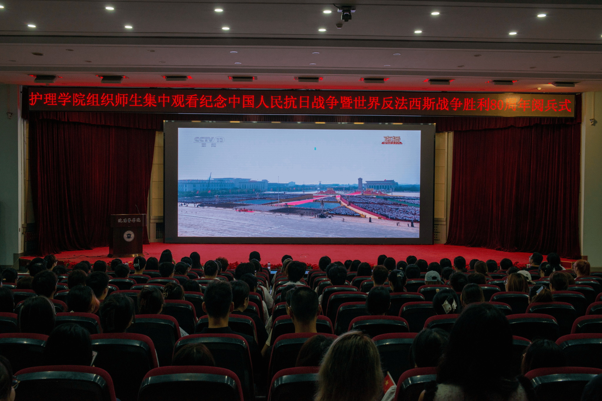 为纪念中国人民抗日战争暨世界反法西斯战争胜利80周年,弘扬伟大抗战精神,激发师生的爱国情怀与历史使命感,9月3日上午九点,qy球友会在图书馆六楼学术报告厅和qy球友会会议室组织全体师生集体观看中国人民抗日战争暨世界反法西斯战争胜利80周年阅兵仪式。